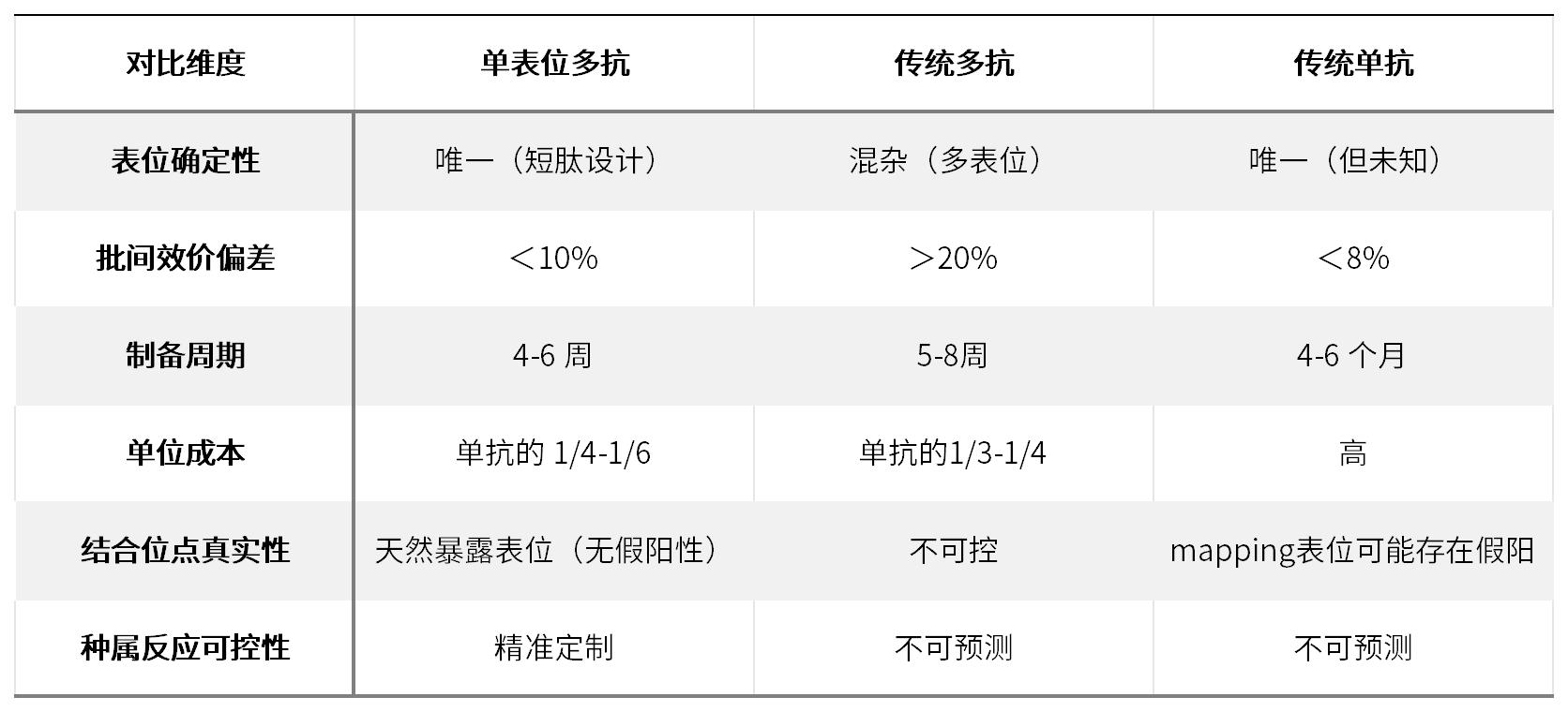 在抗體應用中,“結合位點的精準性、真實性與可控性" 是核心需求,而傳統單抗與多抗均存在明顯短板,“單表位多抗" 通過多肽免疫的特性,形成解決方案: